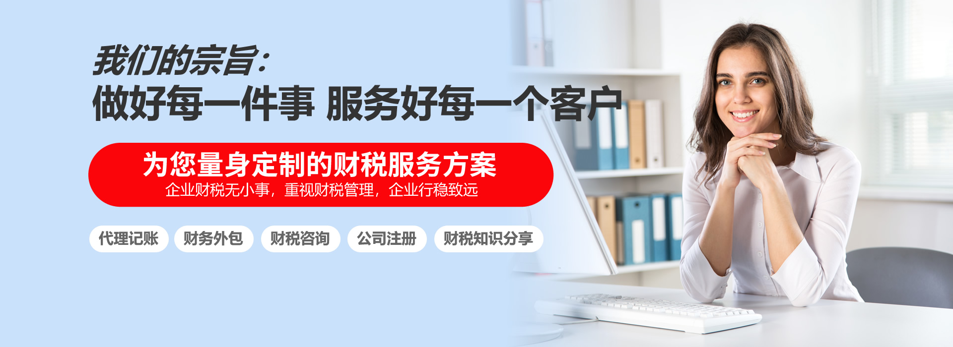 公司愿景:致力于為中小企業主提供專業的財稅支持,致力于為財務工作者提升自我實現自我而努力奮斗。